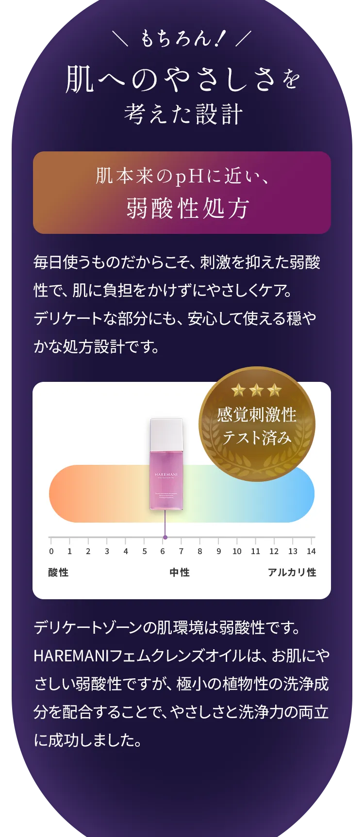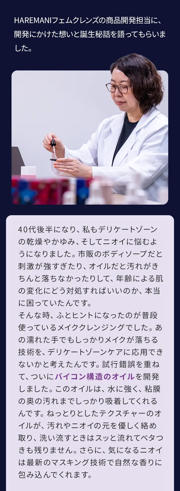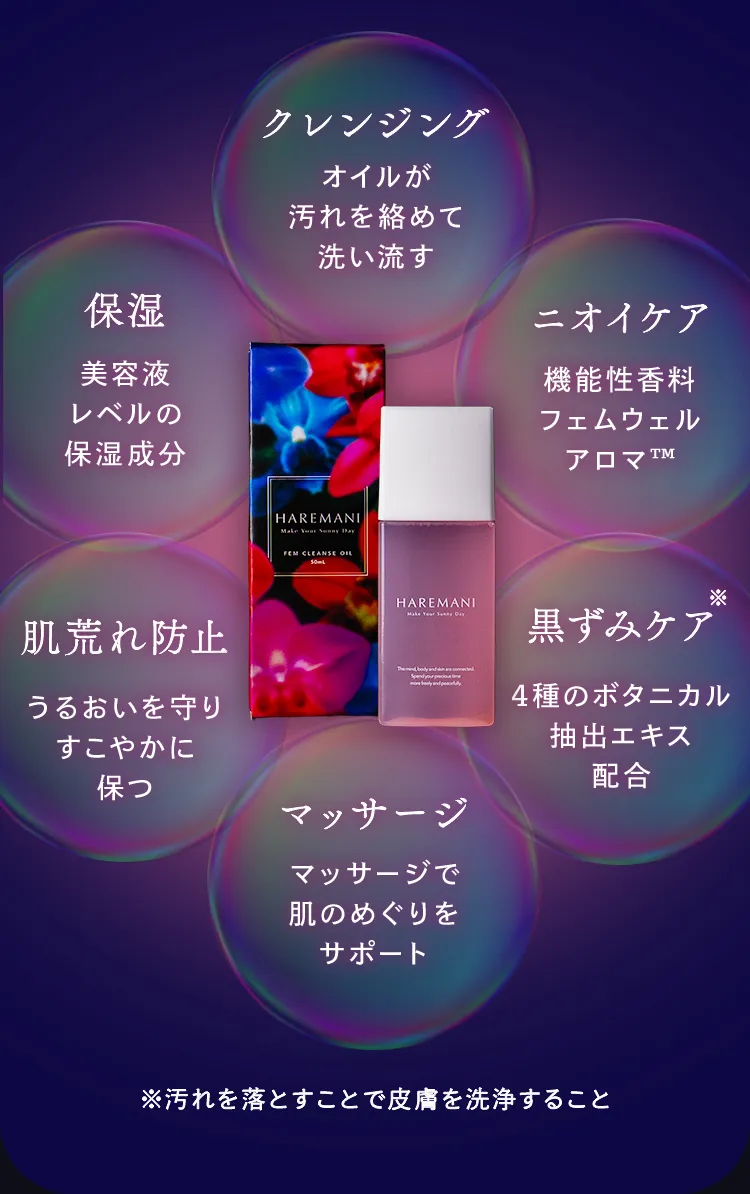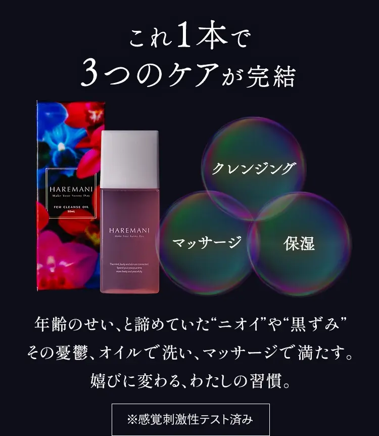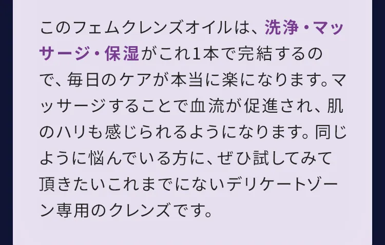 フェムクレンズオイルは、経血によるニオイやムレ、肌の不快感をケアすることを目的に開発されています。