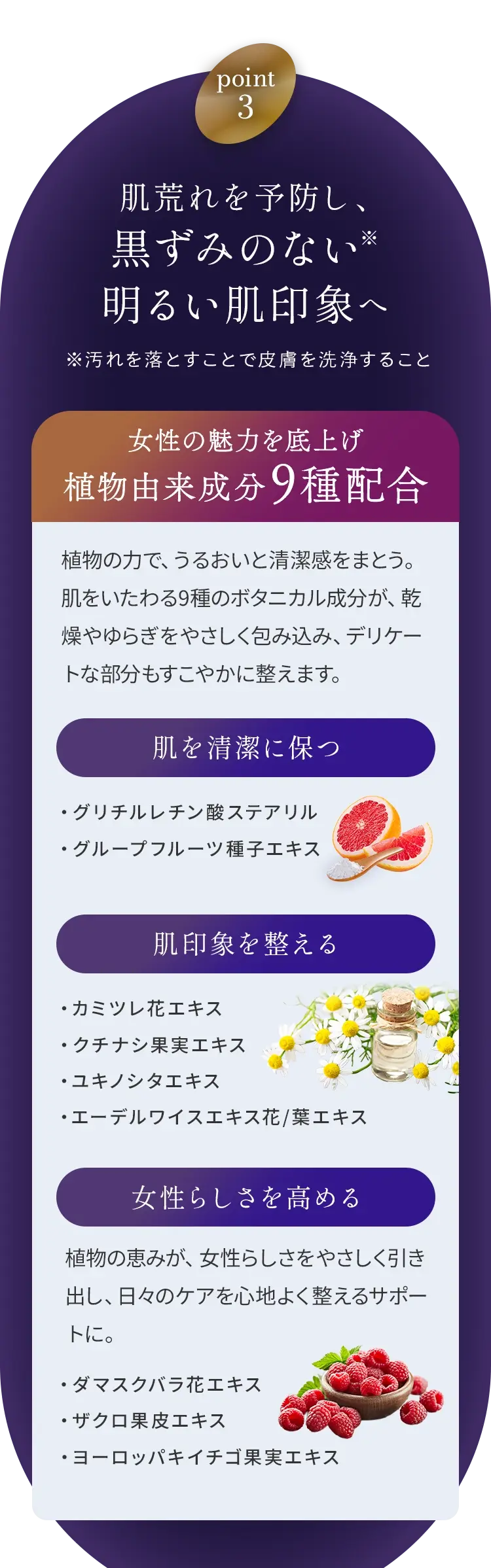 また、敏感になりがちな生理中にも使用できるように、植物由来の洗浄成分を中心に配合しています。